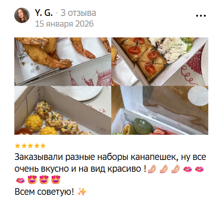KANAPE - это про безупречный вкус и сервис, мы специализируемся на оказании кейтеринговых услуг: от небольшого фуршета до банкета под ключ. С нами - вкусно, удобно и выгодно